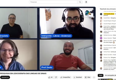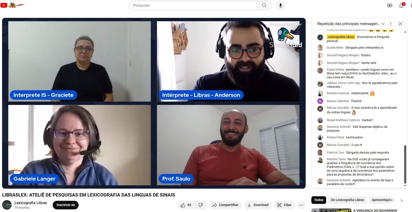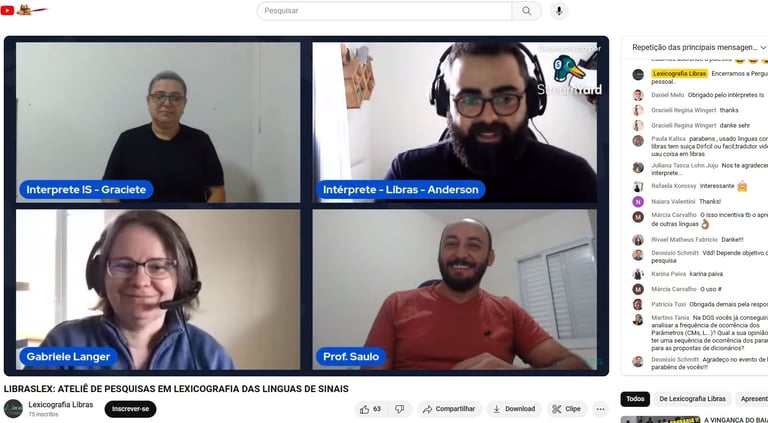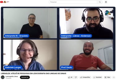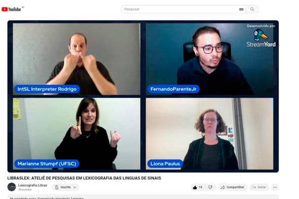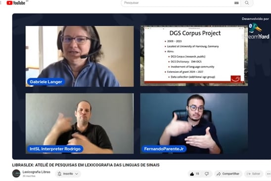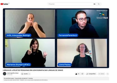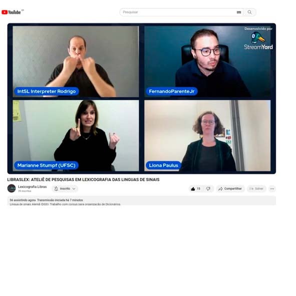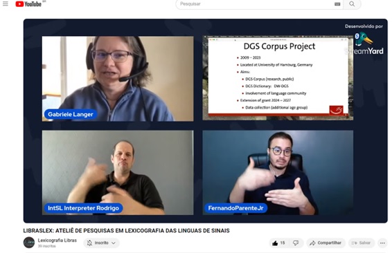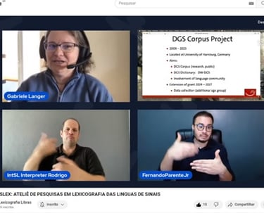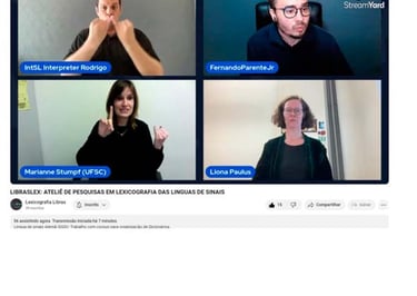 A LibrasLex organizou um evento online transmitido ao vivo pelo StreamYard e compartilhado no YouTube, com o objetivo de apresentar o trabalho da Pesquisadora Gabriele Langer sobre o corpus e a lexicografia das línguas de sinais alemãs, além de interagir com a Prof. Dra Marianne e Prof. Dra. Liona e esclarecer dúvidas dos participantes que assistiram à transmissão ao vivo.